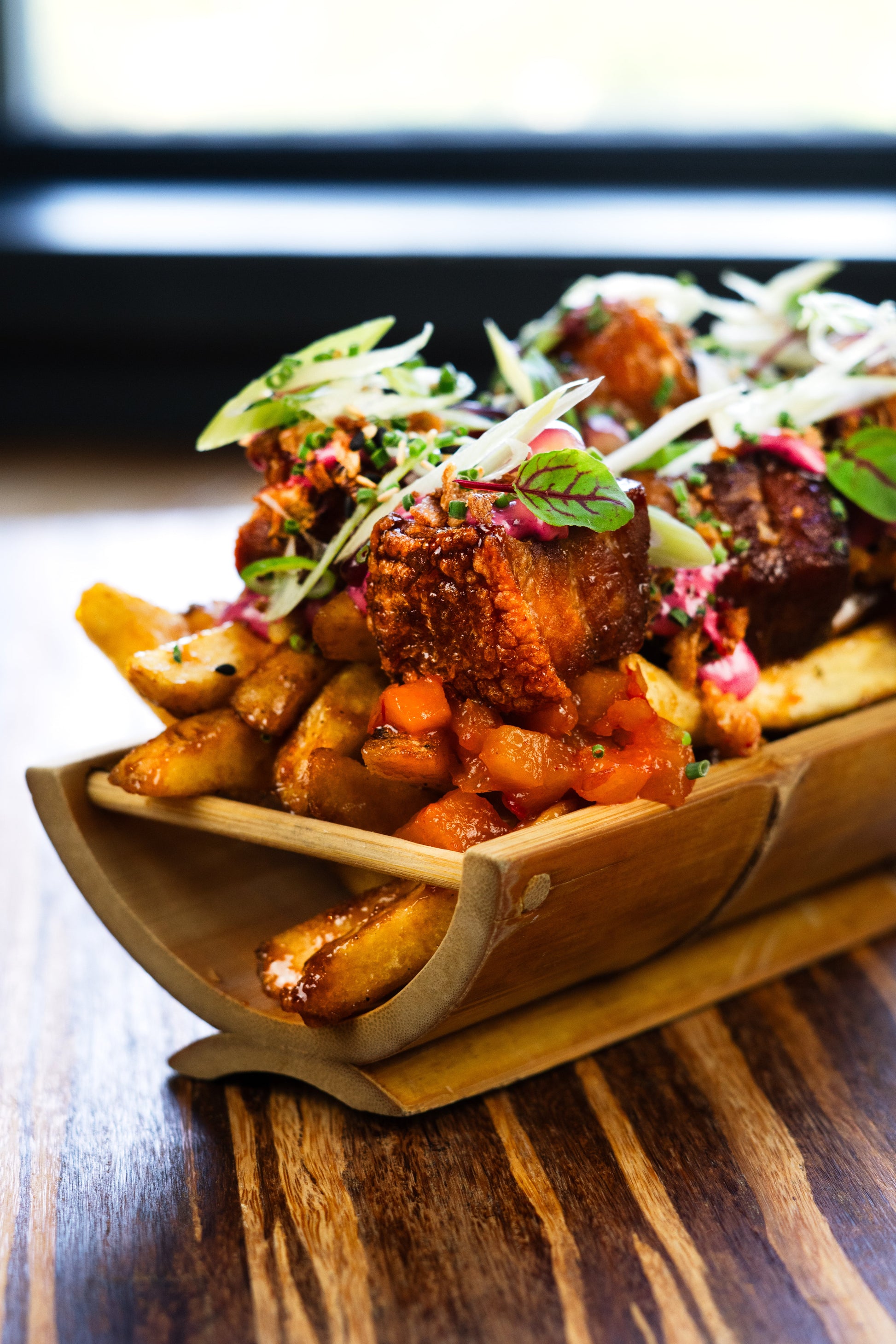Crispy pork belly, toban dian pineapple chutney, pomegranate, mizuna, sumac yuzu mayo