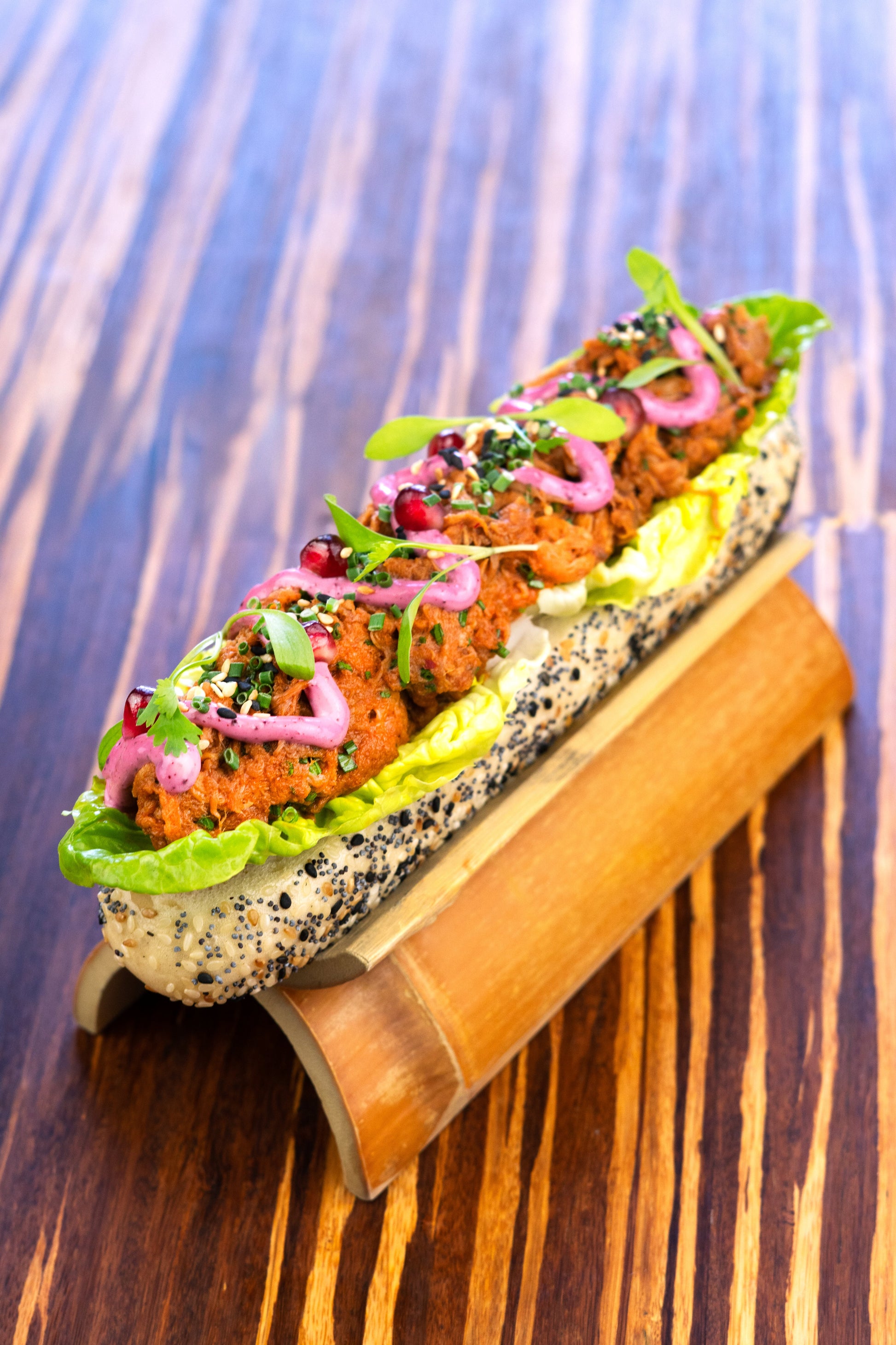 Master-stock braised pulled pork shoulder, baby gem lettuce, pomegranates, sumac yuzu mayo